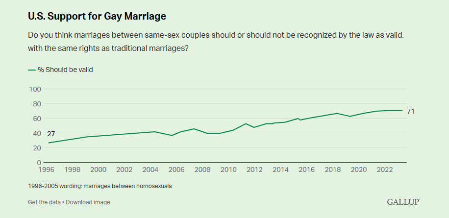 According to a Gallop Pole in February 2023, 7.2% of American adults identified themselves as lesbian, gay, bisexual, transgender or something other than heterosexual. Additionally, overall support for same-sex marriage has steadily climbed in 2023, 71% of Americans felt same-sex marriage should be valid.